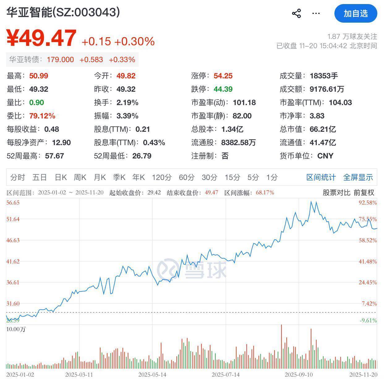 二级市场上,截至11月20日收盘,华亚智能上涨0.30%报49.47元/股,总市值66.21亿元。今年以来,公司股价已上涨68.17%。