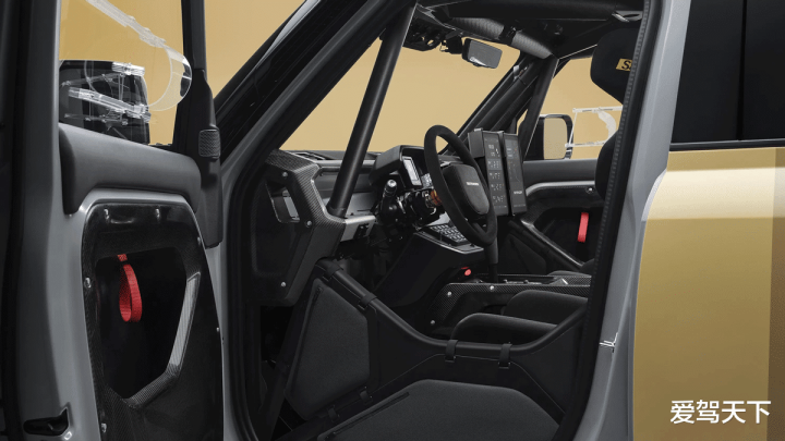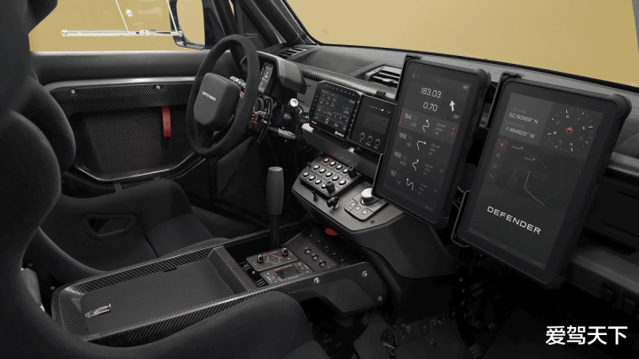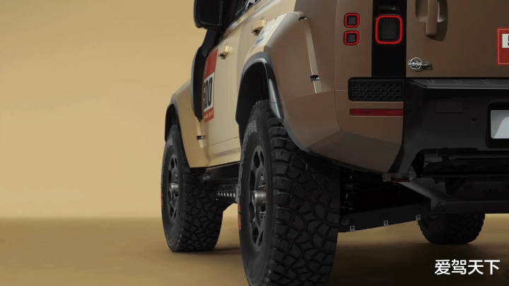 底盘升级是整车核心变化之一。Dakar D7X-R换上了889mm的轮胎、加宽轮距,提高离地间隙,并且搭载了性能版Bilstein减振器。制动部分配备通风盘以及前六活塞、后四活塞卡钳,确保极端路况下的制动效能。动力方面则继续沿用卫士OCTA的4.4升双涡轮增压V8发动机,但改用可持续燃料,8速自动变速箱同样与量产版一致,不总传动比有所降低,以适应越野比赛。