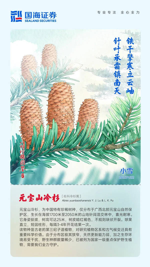 「八桂珍稀图鉴」以二十四节气为时序,邀您共鉴广西珍稀动植物,领略生物基因库、天然药库、香料王国的魅力,感受岭南奇境。“莫怪虹无影,如今小雪时。”玉絮初凝,万物知寒。我们共鉴「八桂珍稀图鉴」第二十篇——元宝山冷杉。
